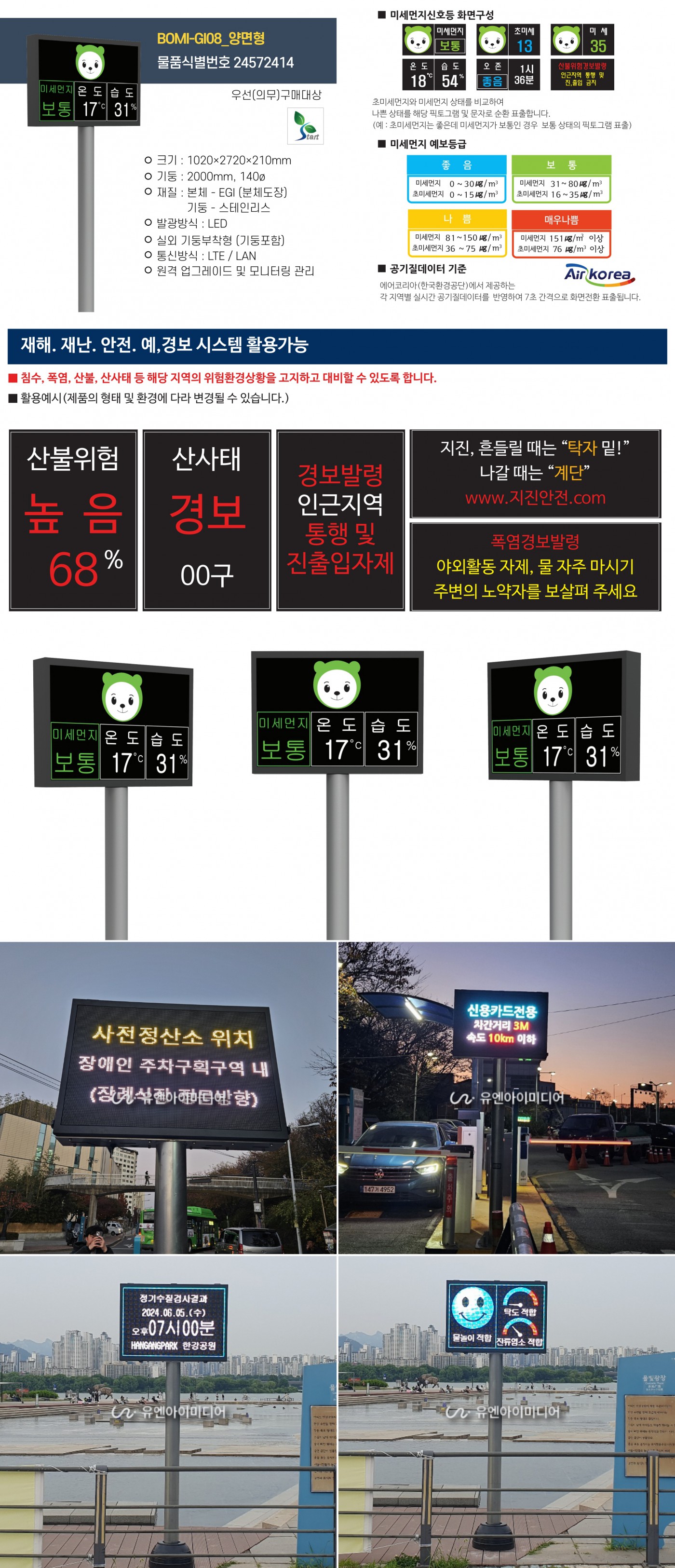 기상전광판 작성자최고관리자 등록일 25-02-13 조회797회 제 품 명 BOMI-GI08_양면형 물품식별번호 24572414 제품가격 9,900,000원(VAT포함) 본문 종합쇼핑몰 바로가기 종합쇼핑몰 바로가기[제품문의] 전 화 : 031-826-9847 이메일 : uni9847@ueni.co.kr 댓글목록 댓글목록 등록된 댓글이 없습니다. 기상전광판 기상전광판 목록